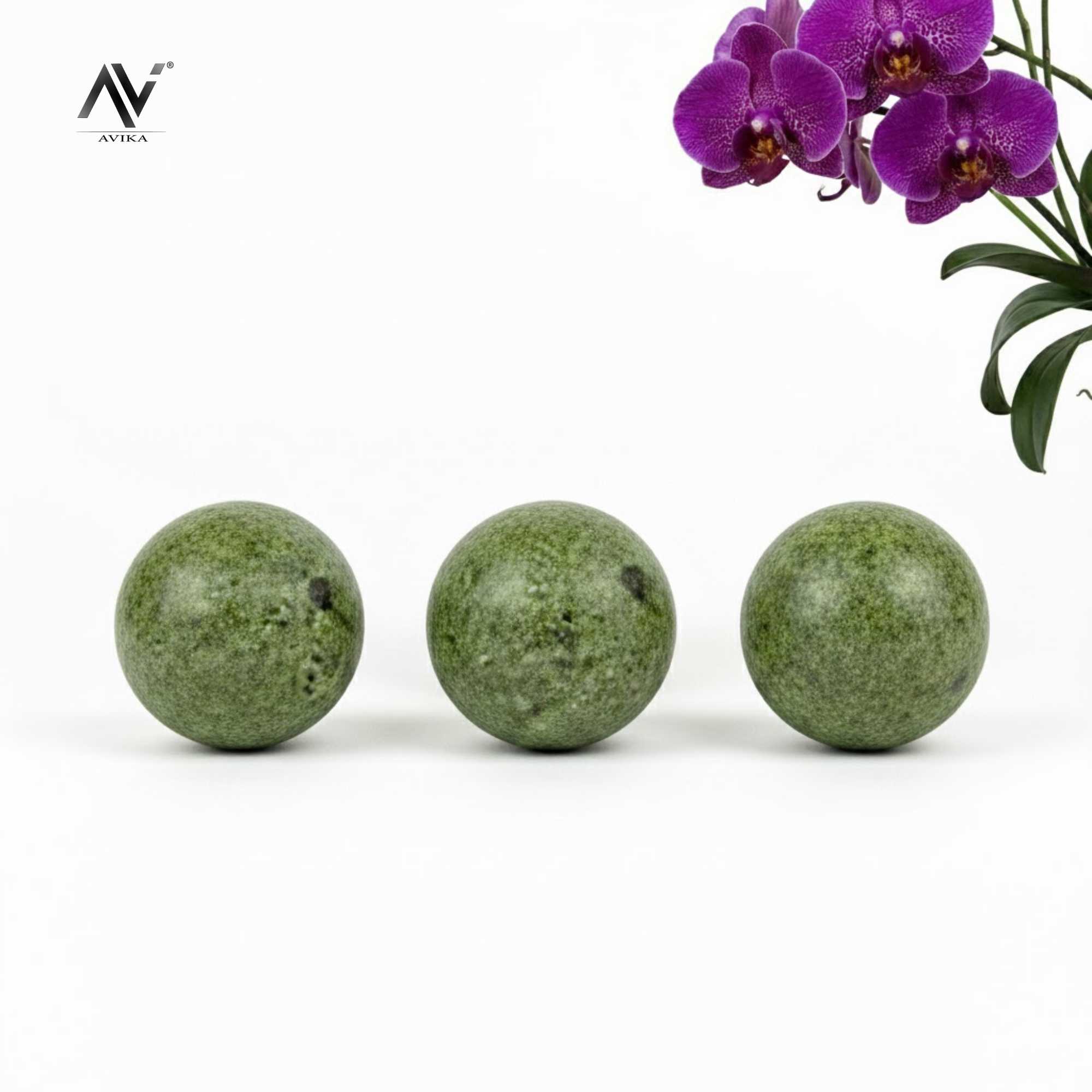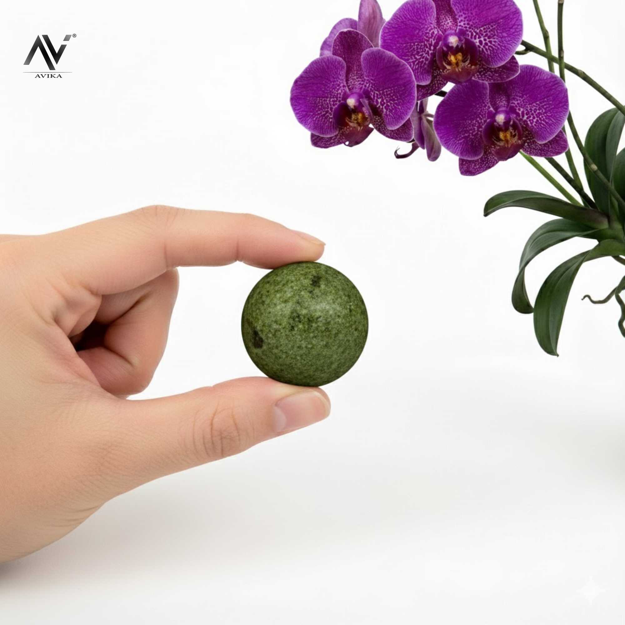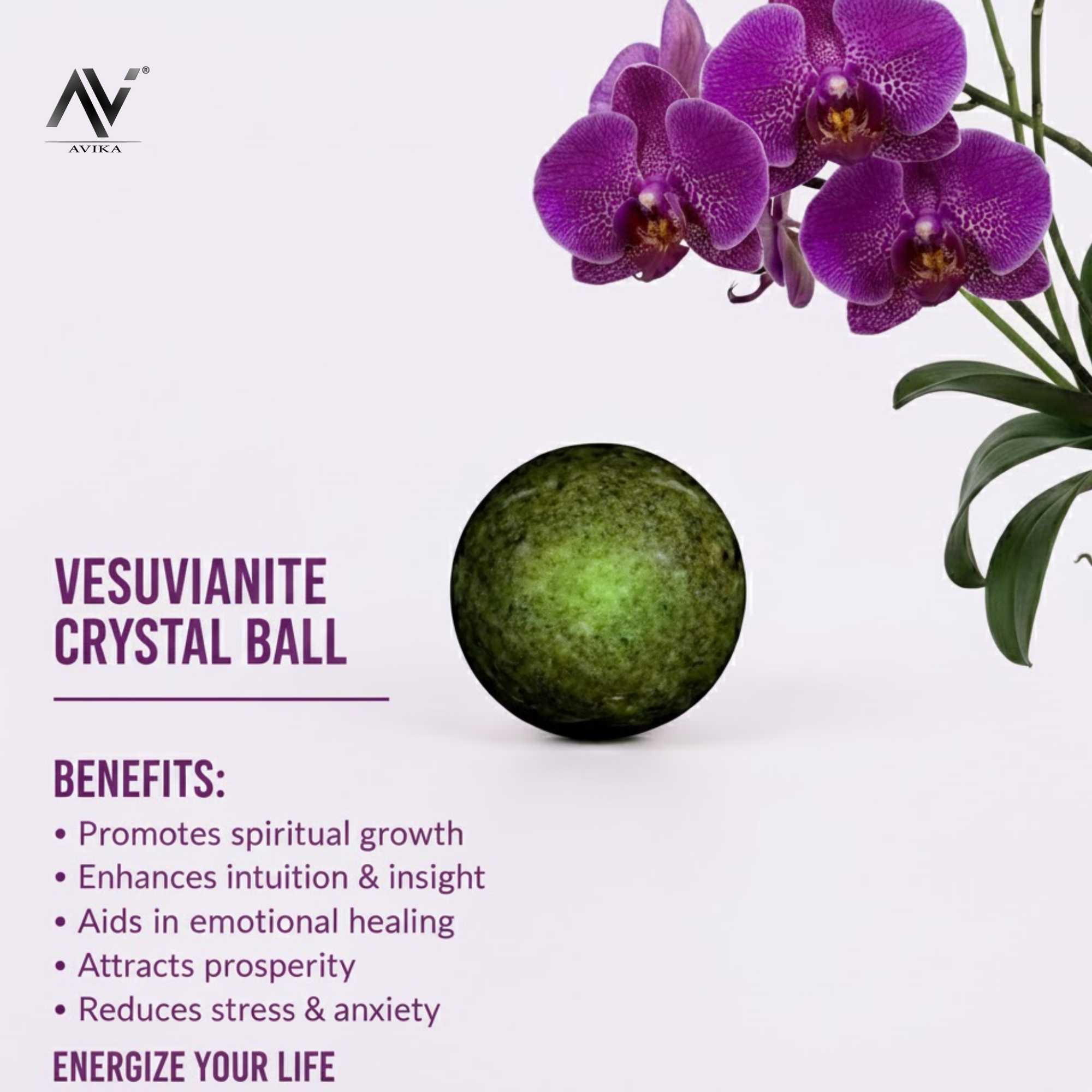 Avika Natural Vesuvianite Gemstone Sphere/Balls is a wonderful mineral for any crystal lover. Vesuvianite can be useful when needing to clear negative and/or repetitive thought patterns from the mental and emotional bodies. Once these thought patterns have been cleared, the mental/emotional bodies will stabilize. Use Vesuvianite to remove/release pent up anger and fears. Calming Vesuvianite acts quickly, yet gently to help find balance when the emotions are in turmoil. Vesuvianite helps to connect the Heart Chakra with the spiritual realms, accessing the higher self and its connection to Source, which is love. Physically, Vesuvianite strengthens teeth and bones; aides in nutrient absorption; alleviates skin ailments; may increase one