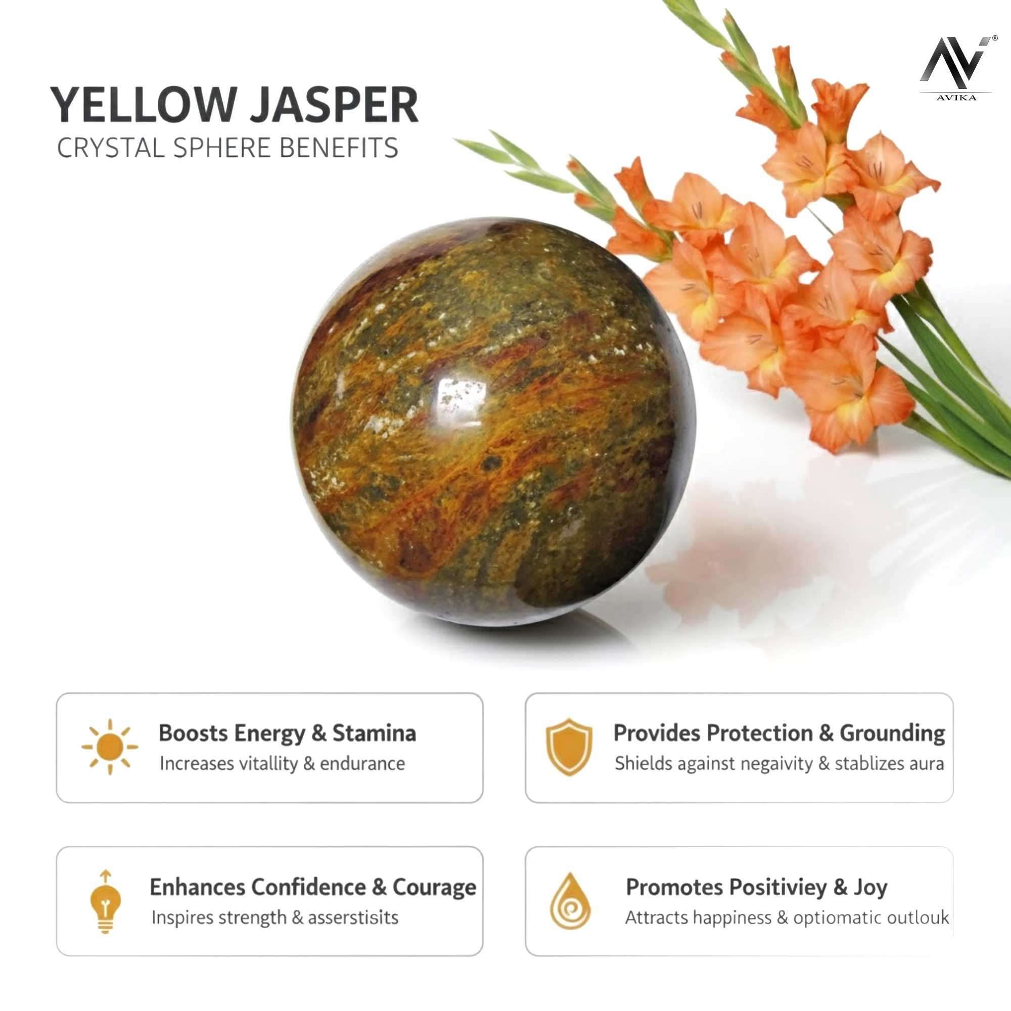 Avika Natural Yellow Jasper Gemstone Sphere/Balls sustains and supports during times of stress. Jasper is one of the oldest known gemstones. It is mentioned in the Bible several times. Jasper is a strong securing gemstone. It is a stability gemstone and is a powerful protection against things that are not good for you and it eases emotional stresses