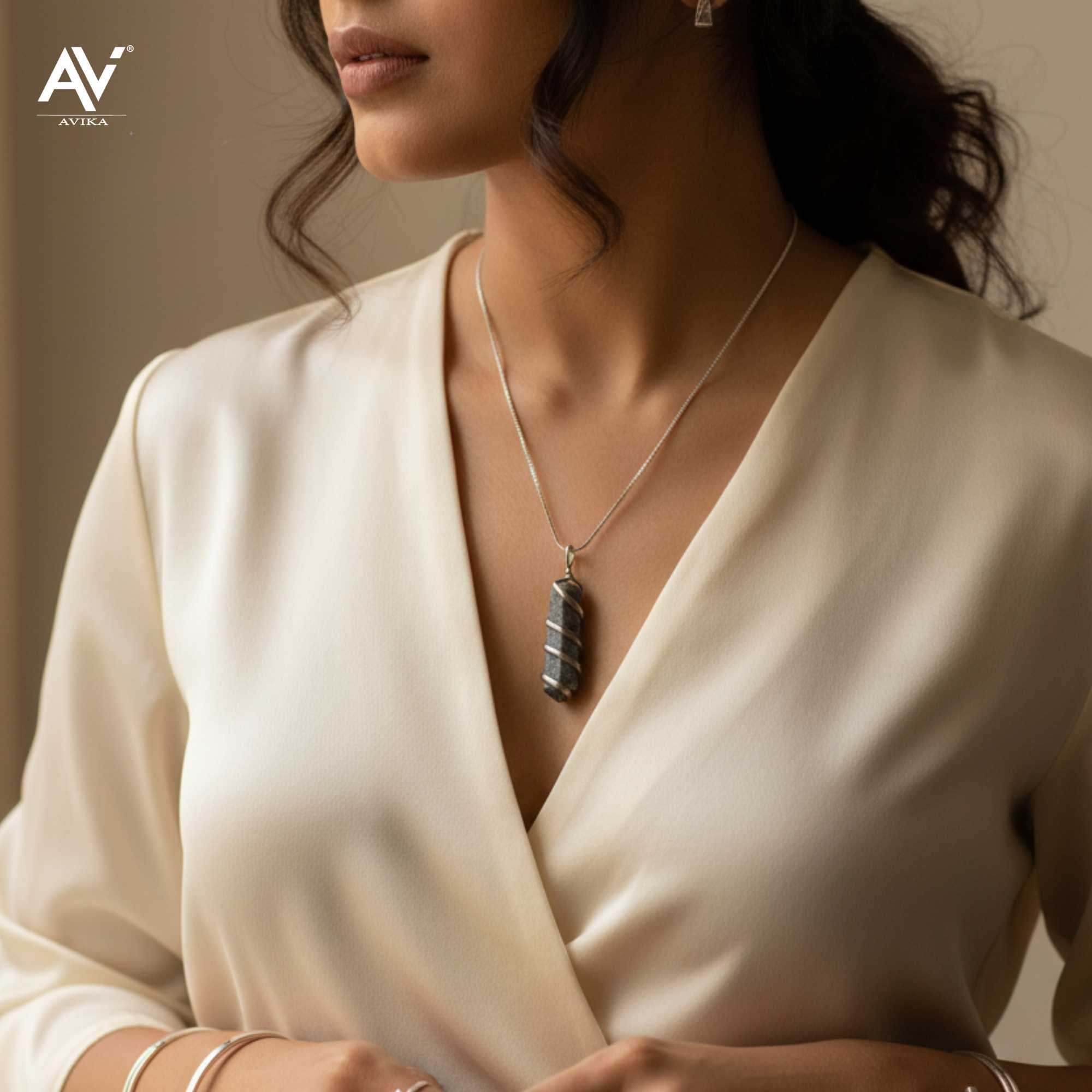 Avika Grey Aventurine Double Point Pendant is beautiful gift for you and your loved ones. In belongs to the family of Aventurine crystals found easily all over the world. As the name suggests the crystal is to remove grey or negative emotions and thought pattern and makes one happy and energetic. Upon keeping this Stone, one may experience serenity with the power of almighty. Note: These are natural stones and only shape has been given. Please note that you will be sent a similar pendant which is 100% natural. Availability may subject to in stock product. Data is collected from information provided by healers all over the world. We do not claim anything. The Picture is an indicative as these stones are natural, their color and size may vary as per their occurrence in their nature. (Rest information will be given along with the products).