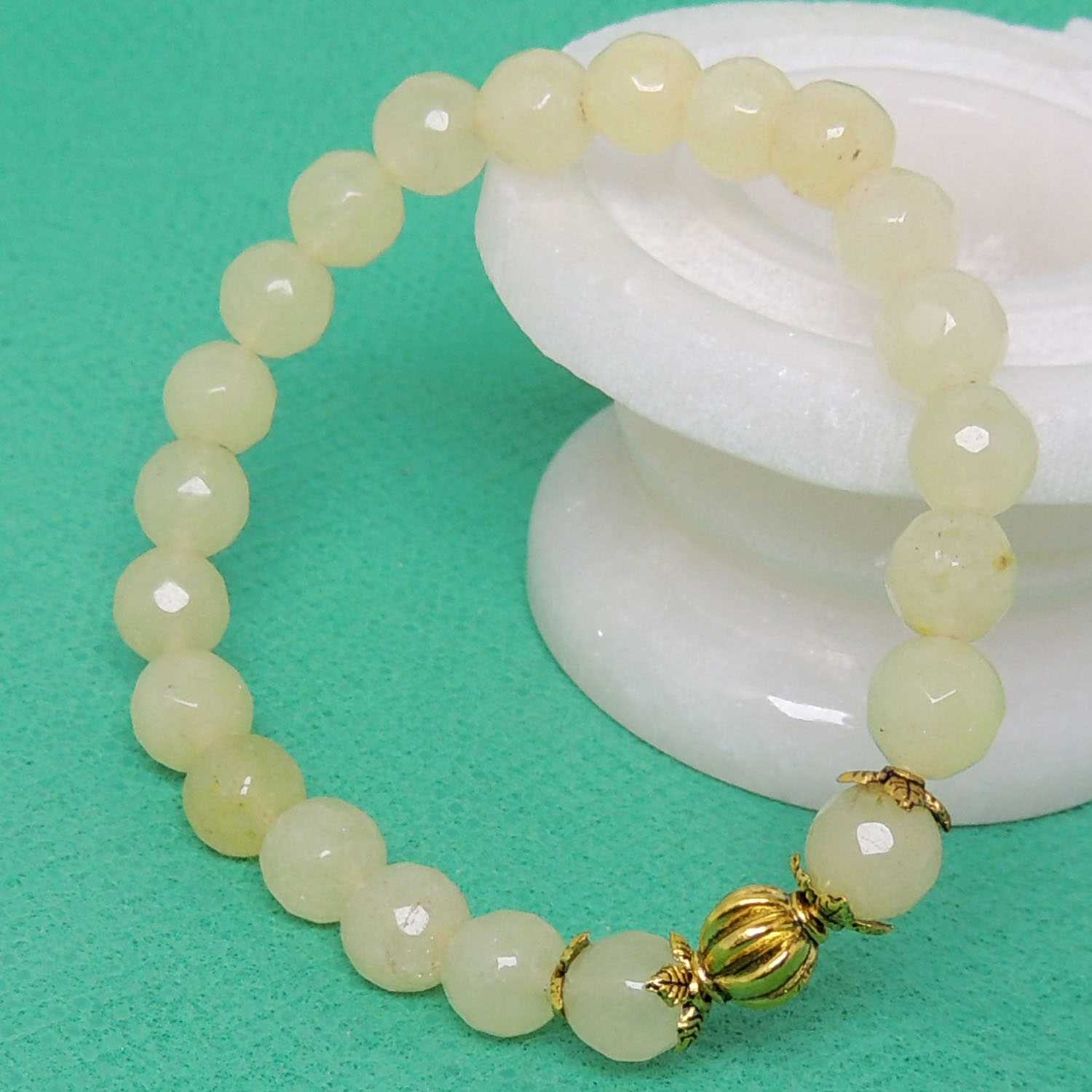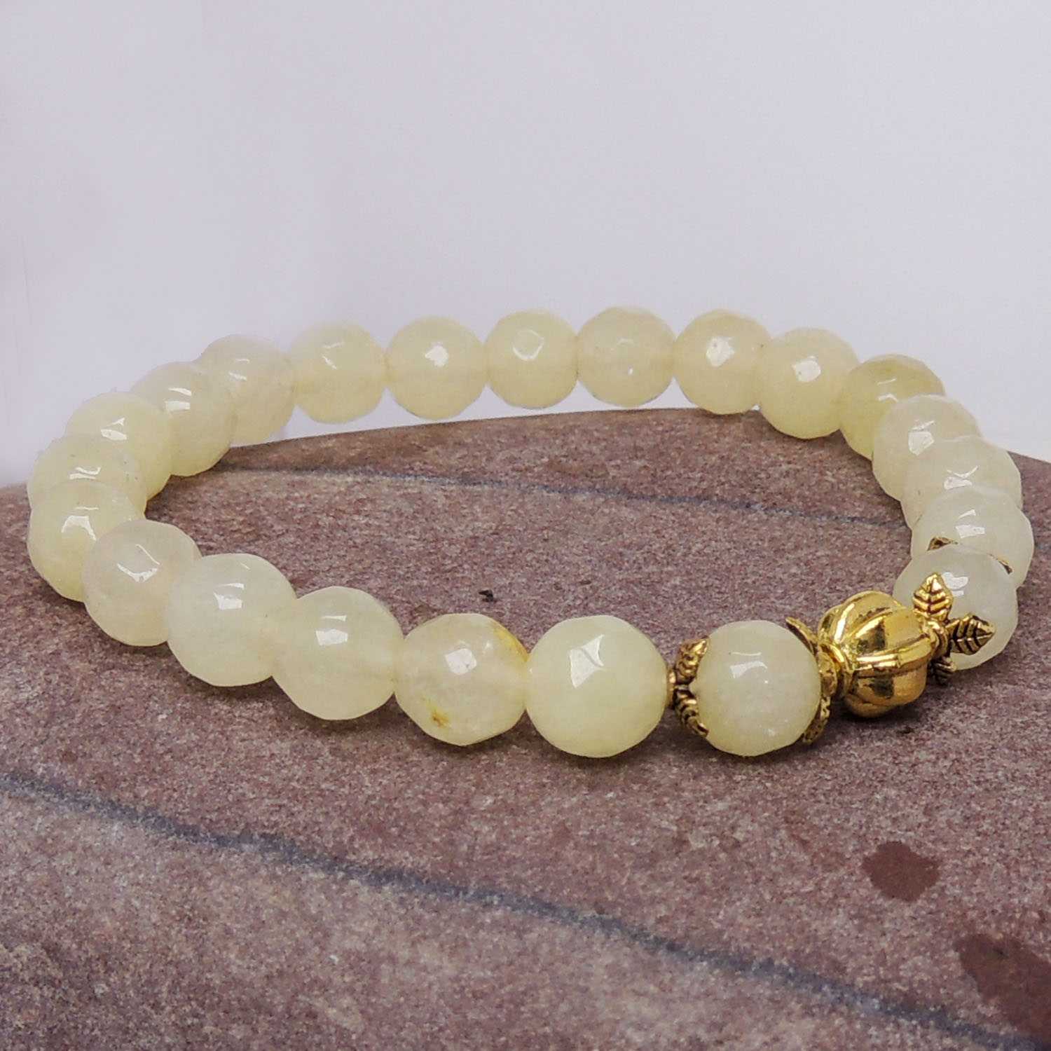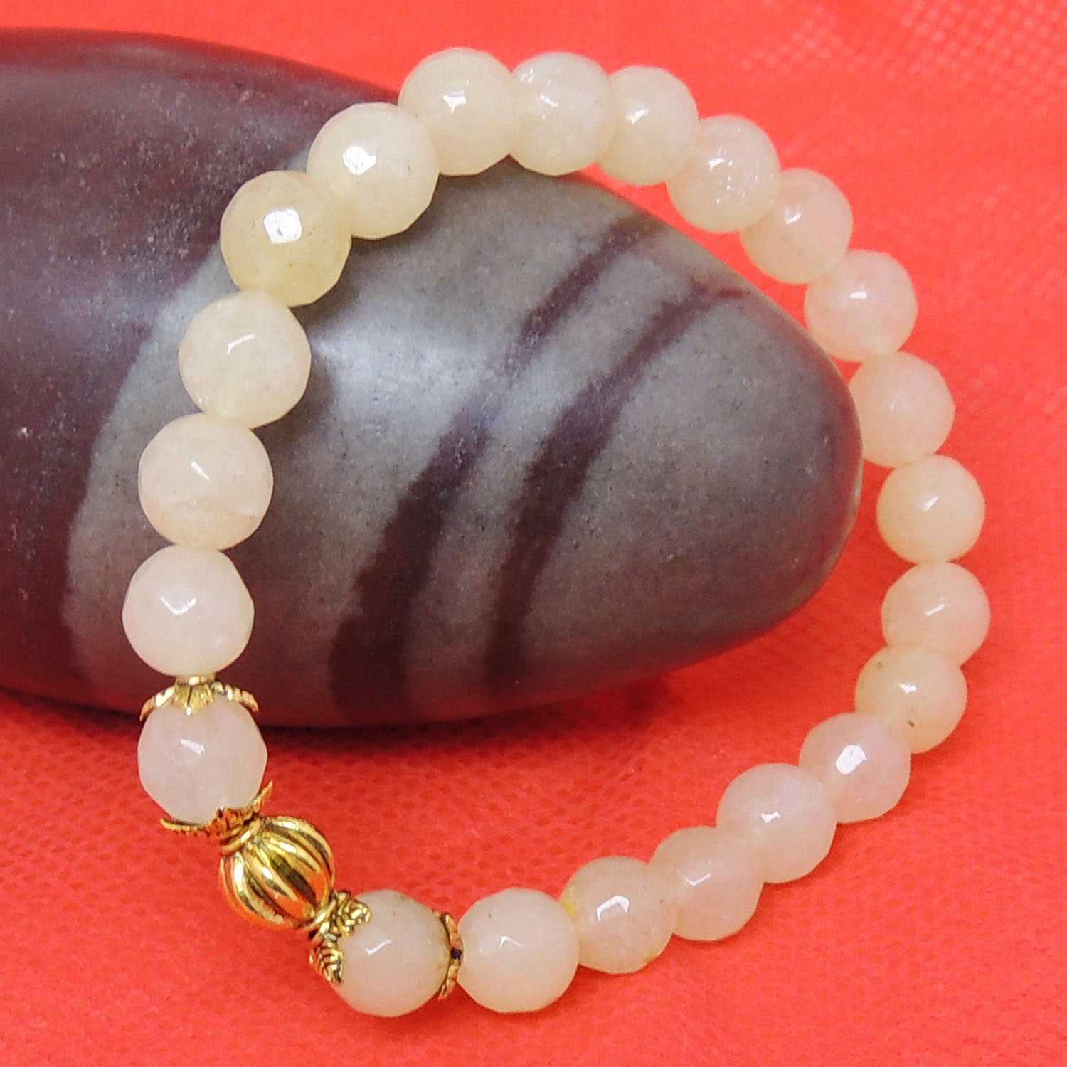 Avika Heat Processed Calcite 8 mm Bead Bracelet Designer 2 is a wonderful mineral for any crystal lover. Calcite is a powerful energy amplifier and cleanser. The purifying energy of Calcite cleans out stored negative energy from a room, the body, etc. Use Calcite to clear out old energy patterns and to increase personal motivation and drive.