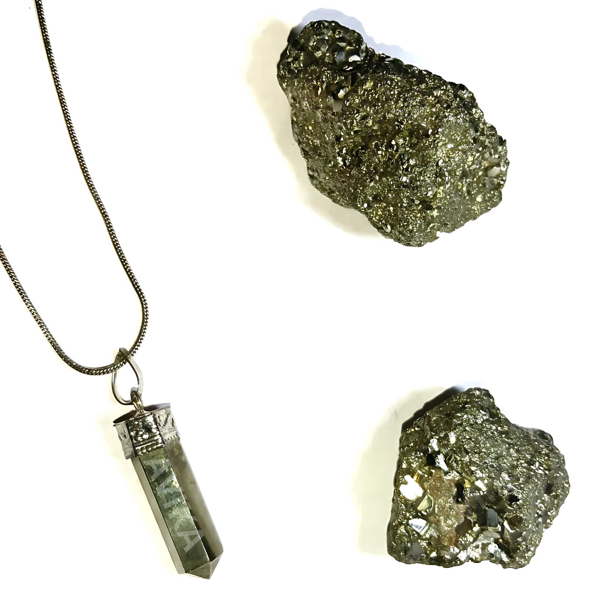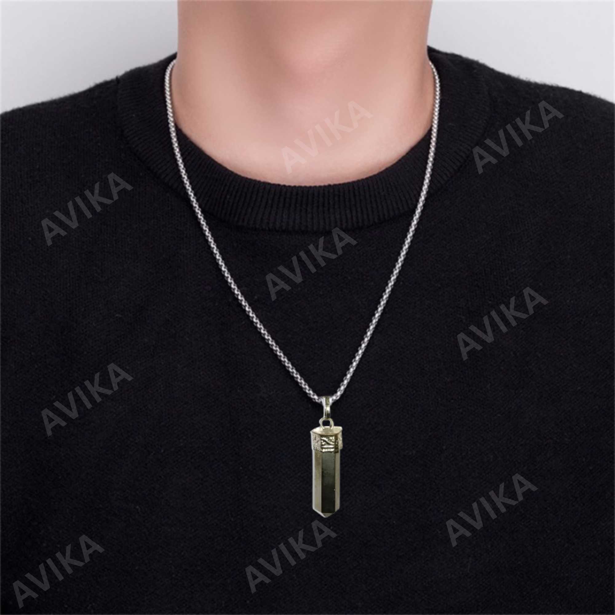 Avika Natural Energized Pyrite Point Pendant For Wealth is a strong stone to promote positive thinking and manifestation. It is a beautiful gold color, and for hundreds of years it has been known as \'Fools Gold\'. It stimulates the intellect and enhances memory, helping to recall relevant information when needed. It can be used in the treatment of bones and in the healing of cell formation.