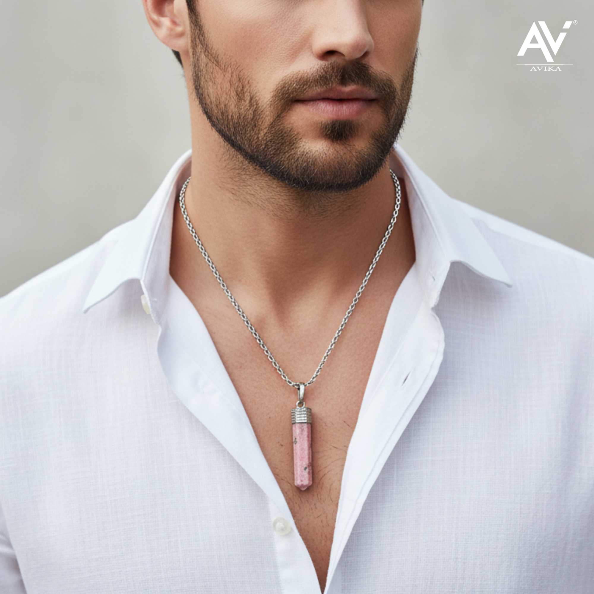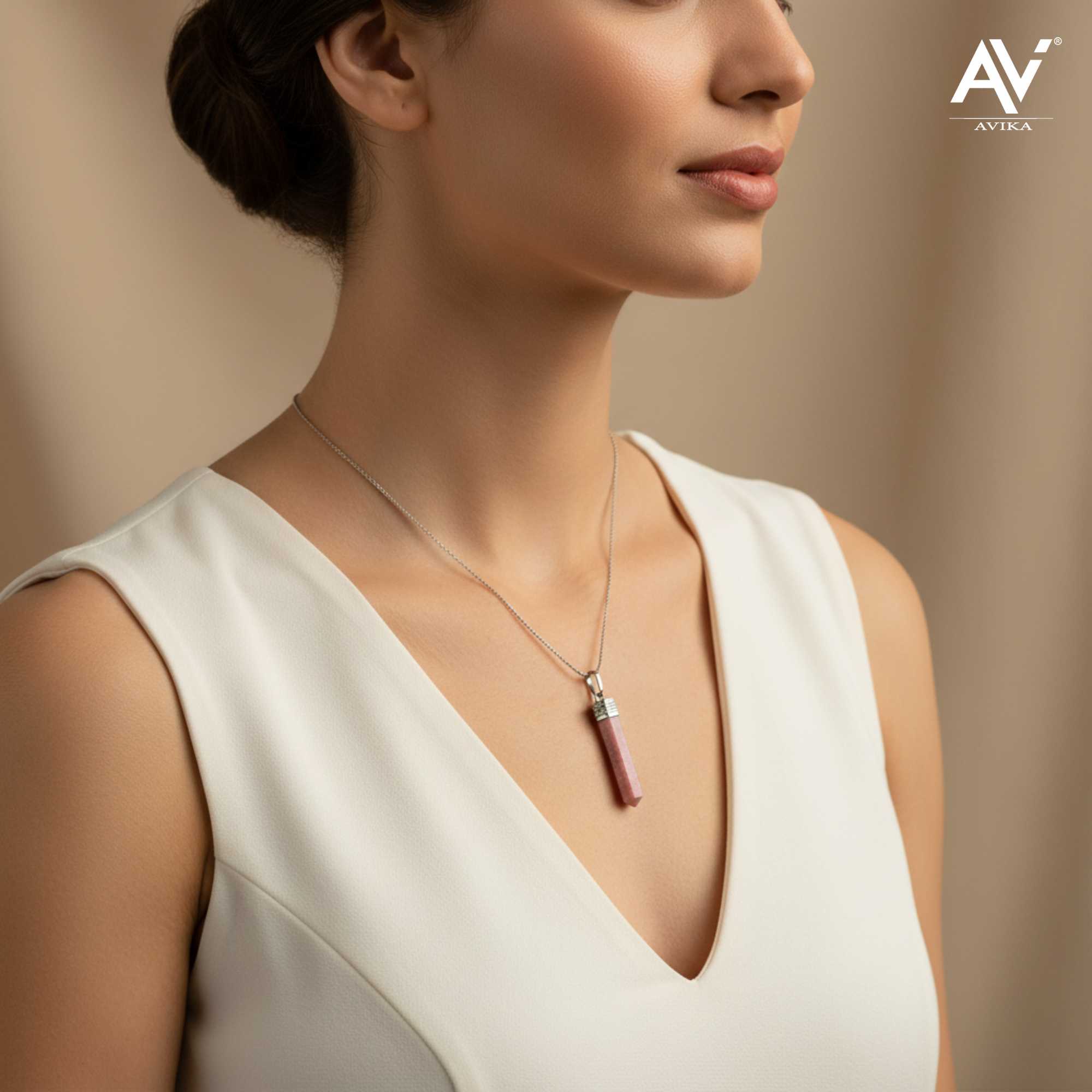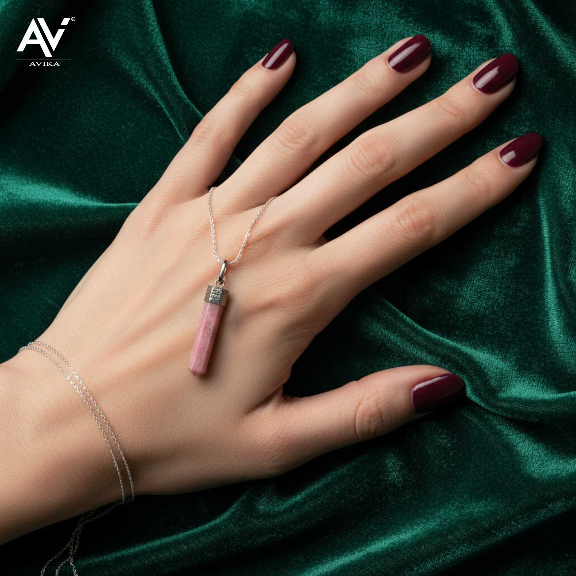 Avika Natural Energized Rhodonite Point Pendant is made up of natural Rhodonite e healing stone. It is a stone of compassion, an emotional balancer that clears away emotional wounds and scars from the past, and that nurtures love.