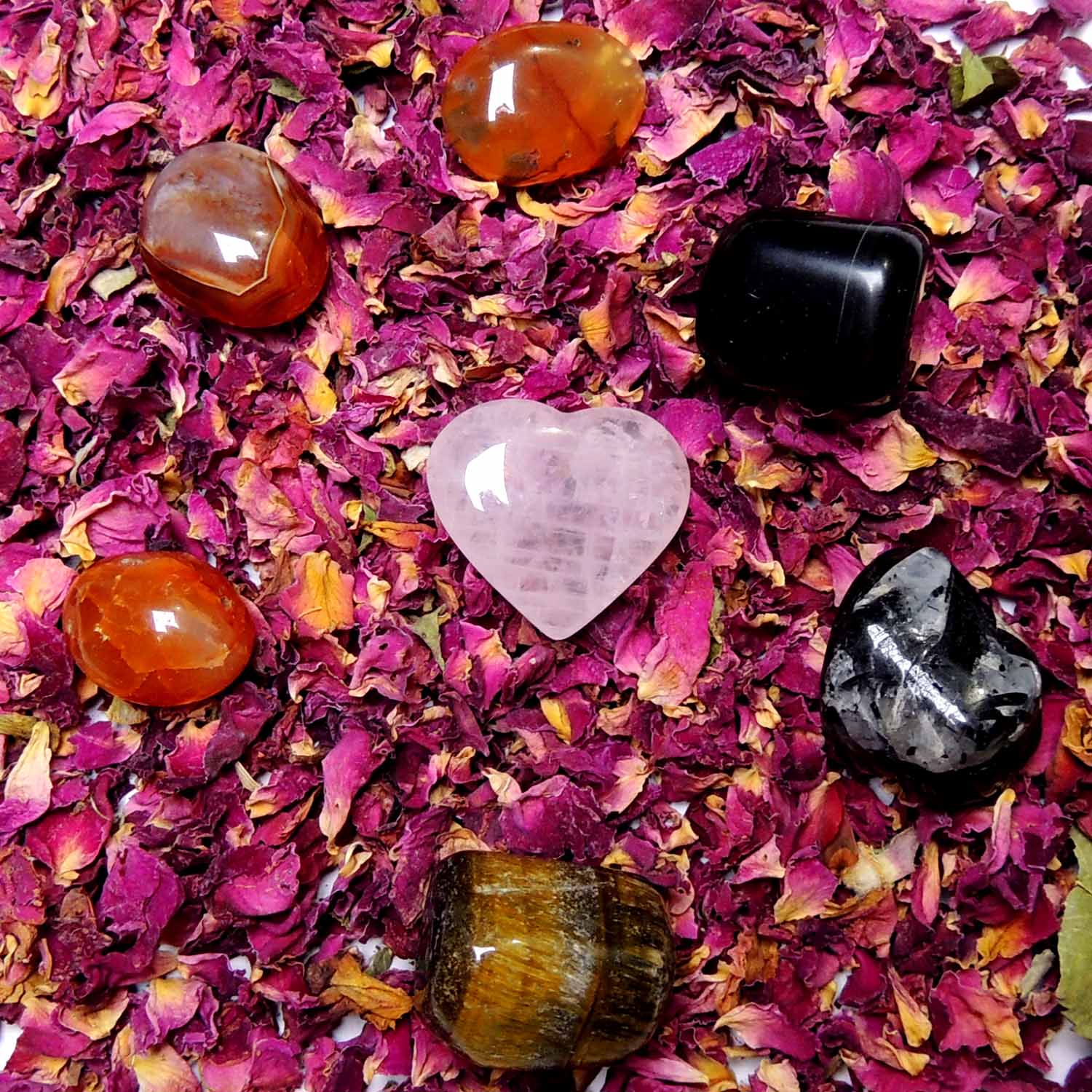 Avika Special Valentine Chocolate/Rose Petals/Crystals Gift with Love The biggest happiness in life is to love someone and being loved by someone. Then why not to celebrate this precious moment of love with your special one and express your special feelings of love and care for him/her, on the special occasion of Valentine with gifting him/her the valuable set of Avika CRYSTALS which are specially energized with the energy of love and protection. The Bouquet of these energized crystals with the bunch of flowers will easily express or show your emotions, your feelings, your care and the most important your concern for your loved one. By gifting these beautiful set of energized crystals, spread the essence of love in the air and let the crystals do their magic and both of you will get flooded with love for each other. This Bouquet of Love includes the energy of 3 pc of Carnelian Tumbled stones (brings joy and friendship, pleasure, and family togetherness), 1 pc of Rose Quartz Heart (represents unconditional love, determination, commitment, and caring), 1 pc of Obsidian Tumbled stone (deepens our connection to the physical, natural world. It brings power and strength, relieving fears), 1 pc of Tiger